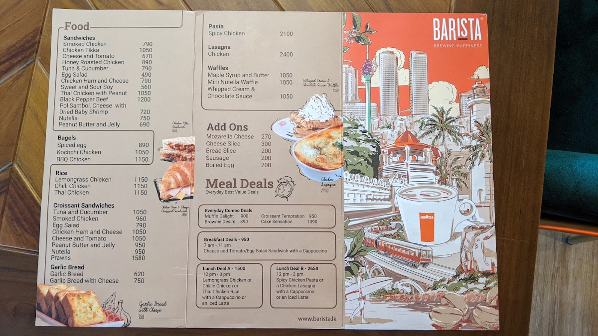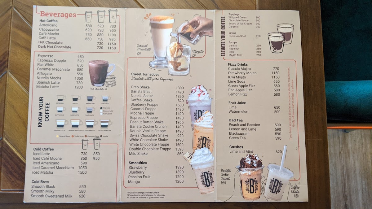 The menu at Barista Moratuwa primarily features a selection of coffee and tea beverages alongside light food options and desserts. The drink offerings include various styles of coffee such as cappuccino, piccolo cappuccino, milk tea, and frappes, catering to both traditional and modern coffee preferences. Additionally, milkshakes and fruit-based refreshing drinks are available.